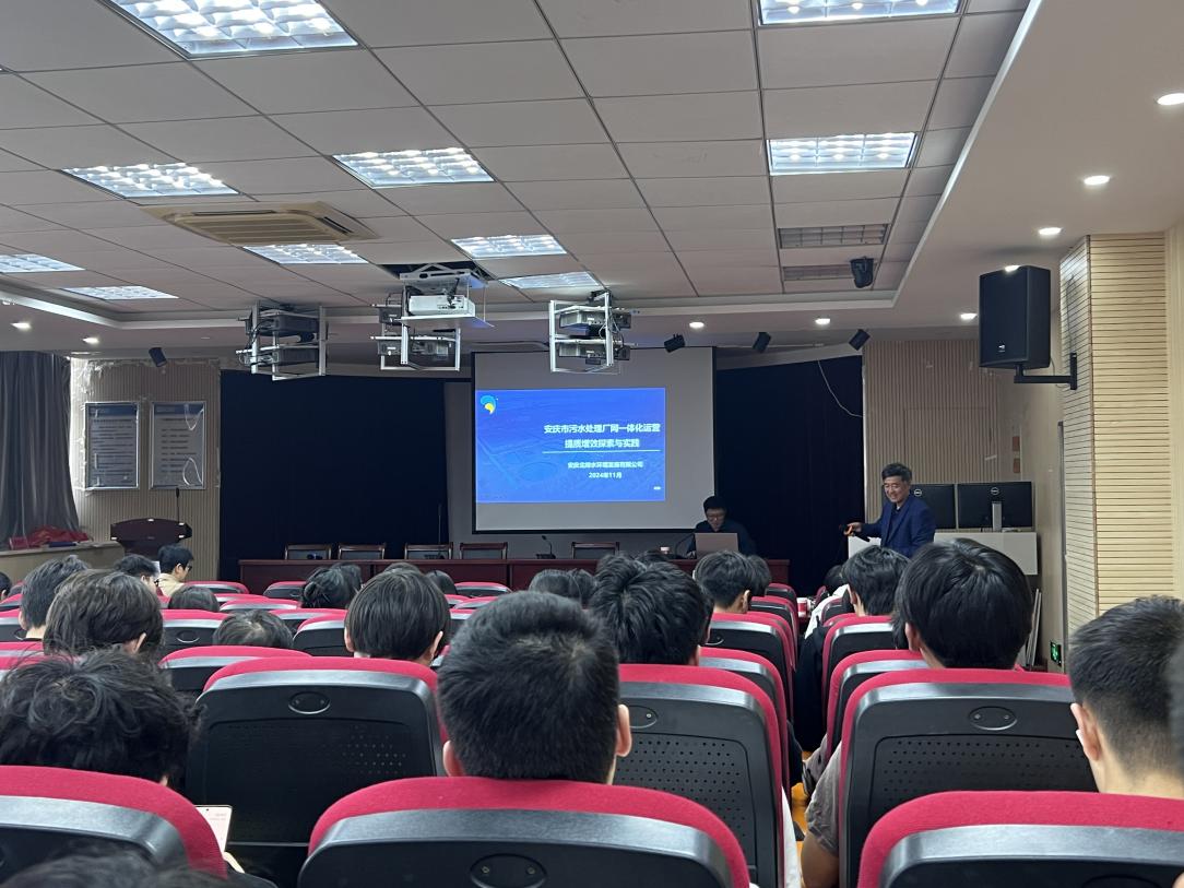 讲座中,杨总介绍了北排集团公司厂网一体化运营模式及具体实践现状,重点从项目基本情况、重点工作及实施、项目成效、未来展望等四个方面展开。结合安庆市现状,阐述了北排集团公司承担安庆市污水厂网一体化PPP项目的优劣势分析,总结了安庆北排水环境发展有限公司厂网河一体化发展模式成功经验。