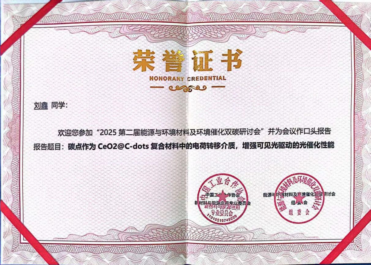 刘鑫汇报了CeO2因其在光催化降解污染物方面的潜力而受到广泛关注;然而,其相对较宽的带隙限制了可见光的吸收,并且有利于光生电子-空穴对的快速重组,大大阻碍了其光催化效率。光电化学表征、密度泛函理论(DFT)计算共同将性能增益归因于C-dots与CeO2之间的协同界面耦合,C-dots的加入优化了CeO2的内部电子转移途径,从而促进了光生电荷载流子的有效分离。本研究证明了C-dots修饰的半导体氧化物光催化剂在处理含染料废水中的适用性。