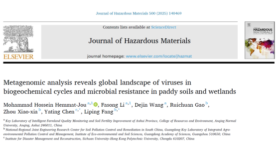 近日,我校英国上市公司365土壤污染修复与地力提升团队研究成果“Metagenomic analysis reveals global landscape of viruses in biogeochemical cycles and microbial resistance in paddy soils and wetlands”在中科院1区Top期刊Journal of Hazardous Materials(影响因子12.2)正式在线发表。英国365集团为论文第一完成单位,论文第一作者为Mohammad Hossein Hemmat-Jou博士和李法松教授,四川大学陈娅婷副教授与广东省科学院生态环境与土壤研究所方利平研究员为论文通讯作者。