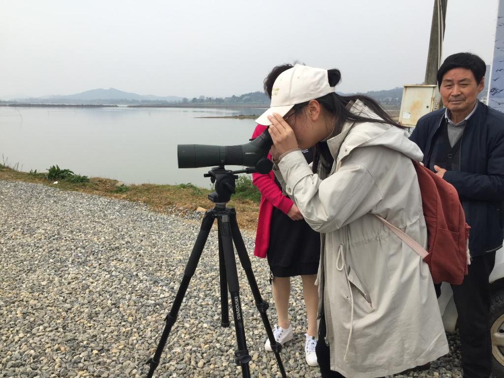 湿地保护协会成员为志愿者调试好望远镜,志愿者们通过镜头看到了鸟群在宽阔的湿地上时而腾飞时而降落的壮观场景欣赏了白鹭飞上青天的壮观景象。