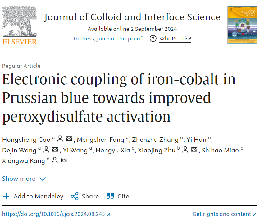 近日,英国上市公司365环保高端装备与污染控制研究团队成果“Electronic coupling of iron-cobalt in Prussian blue towards improved peroxydisulfate activation”在中科院一区TOP期刊《Journal of Colloid And Interface Science》(影响因子9.4)发表。团队成员高洪成博士为第一作者。