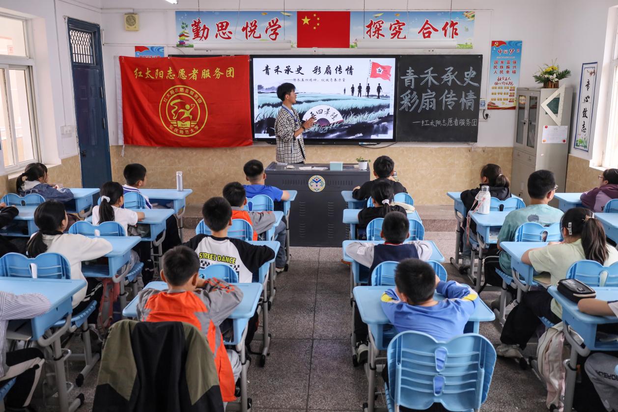 宣讲结束后,环境科学与工程类专业2024(2)班的胡恩泽拿出空白团扇,分发给围坐在一起的小朋友们。“大家可以把喜欢的历史人物形象或图案画在扇子上!”在胡恩泽的耐心引导下,Q版的鲁迅、李大钊、陈独秀以及不同的图案被学生们“复刻”在纸上。用笔尖先勾勒出图案的轮廓,再填充颜色、晕染色彩,五年级(2)班的韩雨茉不一会儿就完成了创作。“我画的是一颗五角星,是光明的象征。”韩雨茉举着扇子向朋友分享。